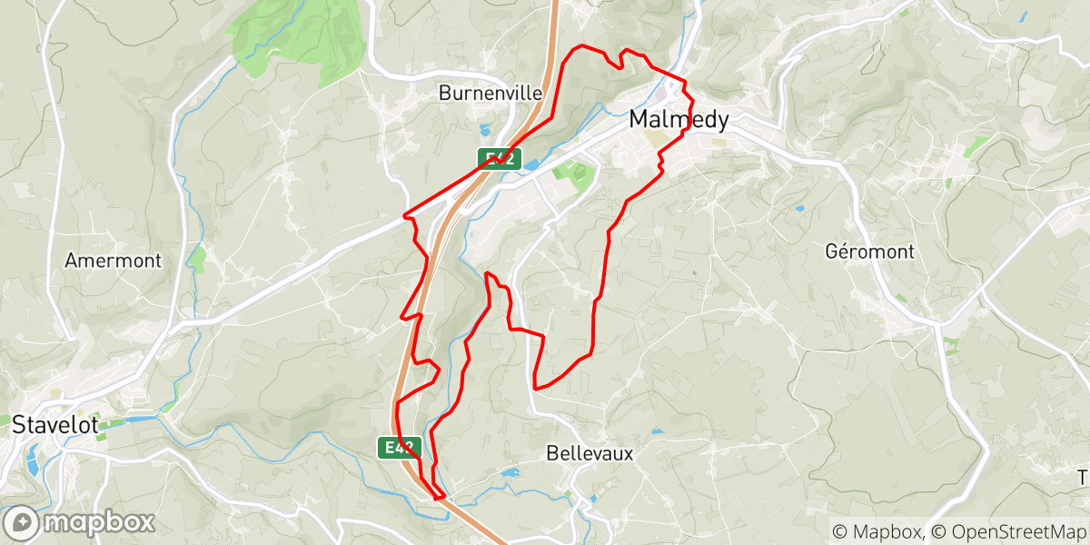 Ga vanaf het Malmundarium langs de hoofdingang van de kathedraal, aan uw linkerkant, waar u omheen loopt tot u uitkomt op een pad dat langs achter om het gebouw loopt. Aangekomen bij de voet van de calvarie, vindt u enkele meters verder het groene parcours. Laat dit rechts liggen en ga rechtdoor in de Rue du Rond-Thier tot u de N68 kruist (Rue de Grands Moulins).