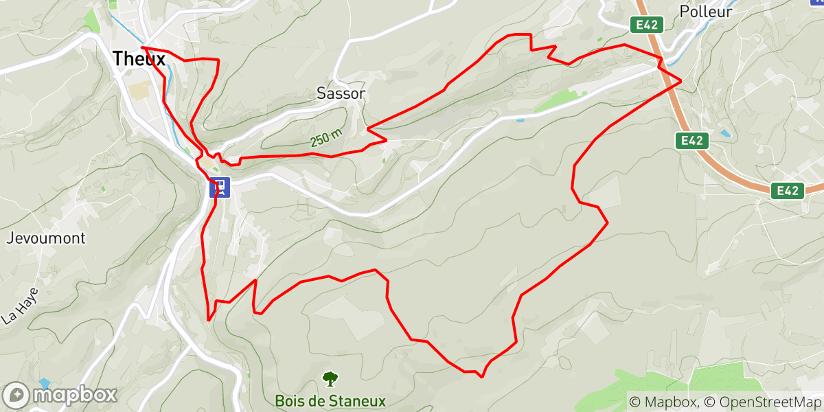 U vertrekt, net zoals bij de andere drie parcoursen, uit het stadscentrum van Theux (Place du Perron en Place Pascal Taskin), hier neemt u Rue de la Hoëgne en vervolgens Rue de la Bouxherie die aan het einde van de straat overgaat op een wandelpad. Dat wandelpad brengt u via een tunnel onder het spoor door rechtstreeks naar de Marché (Institut Saint Roch Theux).