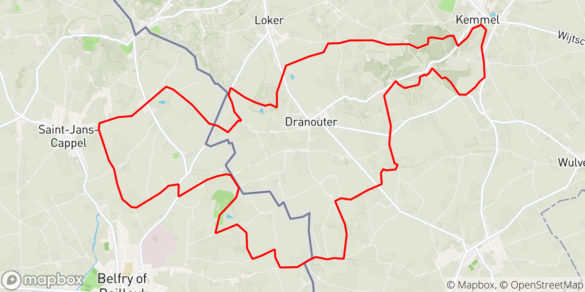 Wie Heuvelland zegt, haalt zich meteen het beeld van een open ruimte met enkele heuvels voor de geest. Via het Provinciaal Domein op de zuidflank van de Kemmel- en Monteberg stap je naar de Zwartemolenhoek en de Ravensberg. Die tweede heuvelrij vormde het decor van de godsdiensttwisten in de 16de eeuw. Bij de Meulen Houck, een buurt tussen Belle/Bailleul en de Zwarteberg/Mont-Noir vat je de terugtocht aan. Straatnamen verraden dat je op en over de landsgrens wandelt. Op de terugtocht geniet je van het natuurgebied Het Eeuwenhout en vormt de Kemmelberg, met zijn 156 m het op één na hoogste punt in Vlaanderen, de laatste hindernis van de dag.