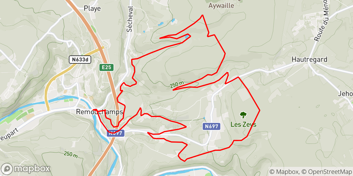 De wandeling vertrekt vanaf de brug van Remouchamps in de richting van het uitkijkpunt Rahir, via de Rue de Louveigné en de Avenue Marcellin Lagarde. Vervolgens gaat de route in de richting van de steengroeven van Mainire door onder de snelweg door te gaan en deze een stuk parallel te lopen. De beek La Gervova wordt overgestoken en een stuk verder komt men uit bij de Rue de Spa en de gehuchtjes Les Eyès en Les Riveus. De wandeling volgt dan een stuk de grote weg en daalt af via de Rue de Presseux Ruz., Rue El Minîre in de richting van Remouchamps en de brug. Percentage bos: 41%.